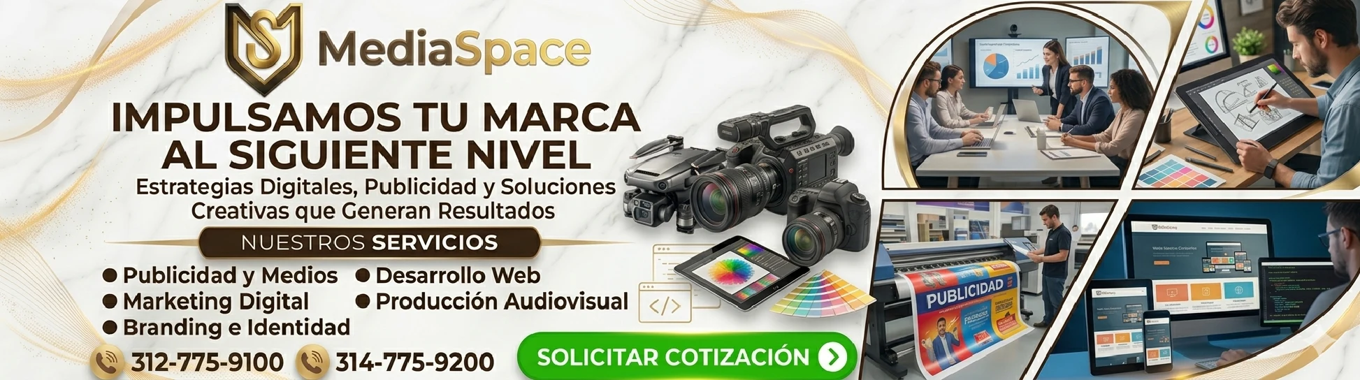 En MediaSpace ofrecemos soluciones integrales para el crecimiento digital de empresas. Nuestros servicios incluyen marketing digital, desarrollo web, publicidad online, branding e identidad visual, producción audiovisual y estrategias de posicionamiento SEO para aumentar la visibilidad de tu negocio.